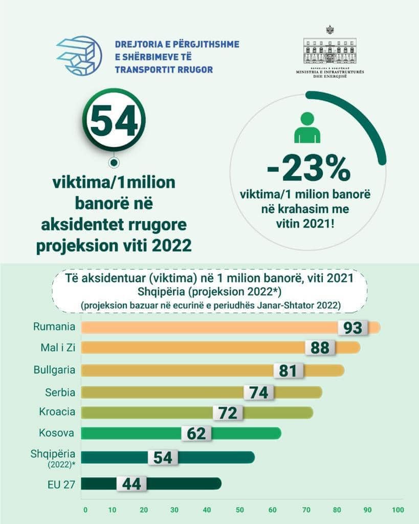Rreth 23% më pak viktima për 1 milion banorë sesa në vitin 2021, 54 viktima për 1 milionë banorë projeksioni për vitin 2022, na bën vendin me uljen më të lartë të numrit të viktimave nga aksidentet rrugore krahasuar me mesataren e Bashikimit Europian.