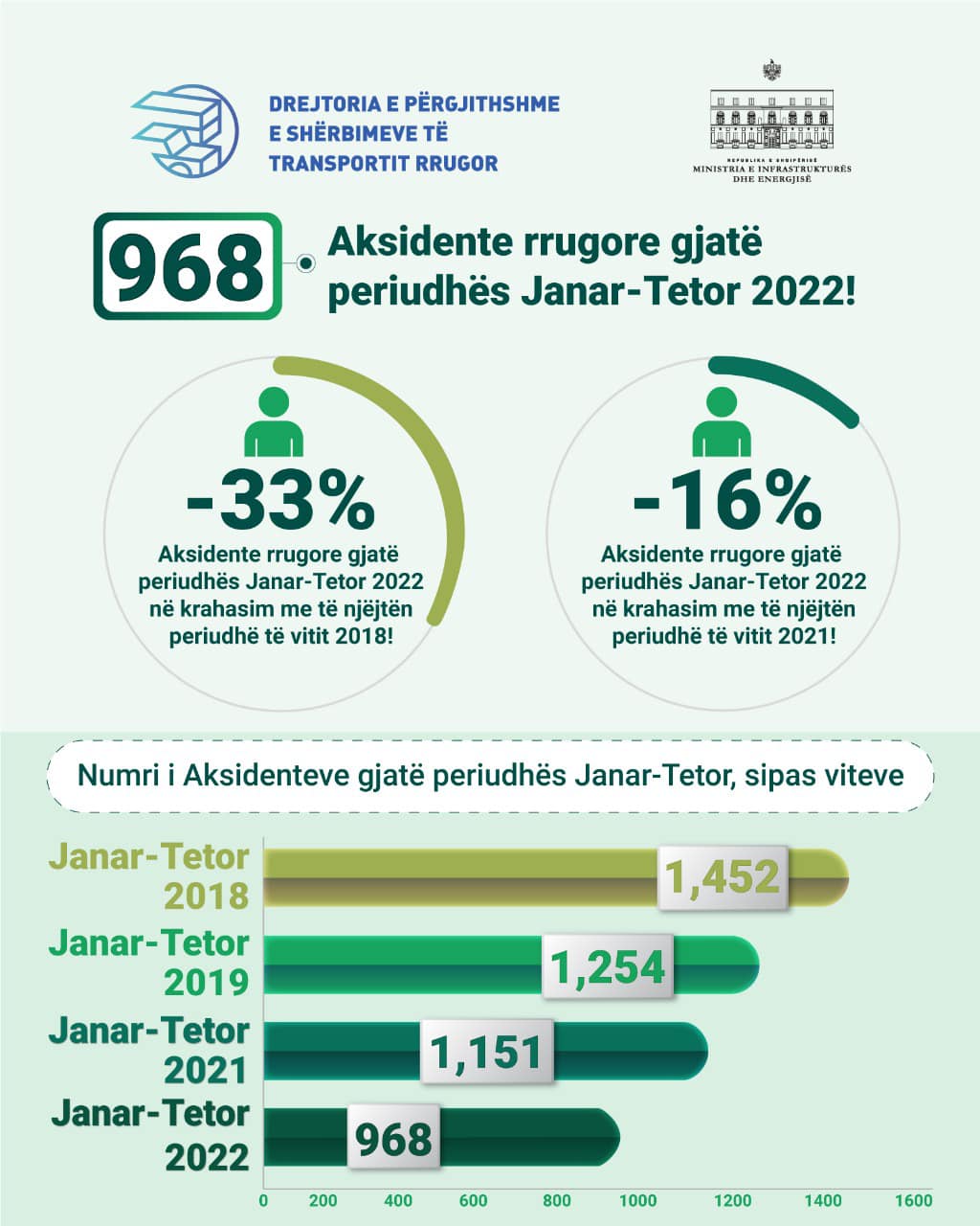 20% më pak viktima për 1 milion banorë sesa në vitin 2021, 56 viktima për 1 milionë banorë projeksioni për vitin 2022, na bën vendin me uljen më të lartë të numrit të viktimave nga aksidentet rrugore krahasuar me mesataren e Bashkimit Europian.
