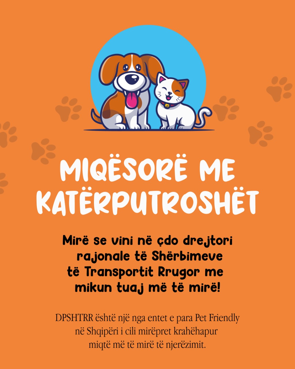 Si një institucion miqësor ndaj katërputroshëve , ju ftojmë të vini në çdo Drejtori Rajonale të Shërbimeve të Transportit Rrugor Shqiptar me tuaj, ku s'keni përse të kushtëzoheni më nëse ju duhet të vini në sportelet tona me shokun tuaj besnik.