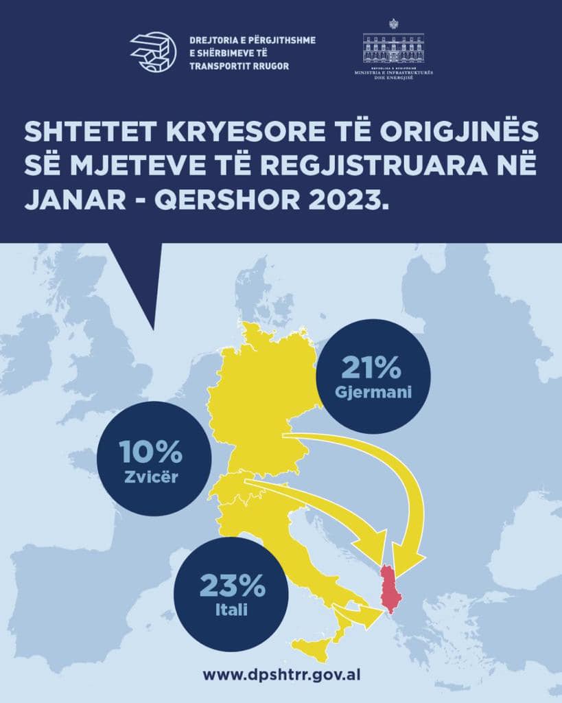 Nga databaza e Drejtorisë së Përgjithshme të Shërbimeve të Transportit Rrugor, përcillen të dhënat në kohë reale dhe me transparencë mbi karakteristikat e flotës së mjeteve në qarkullim. Gjatë periudhës Janar-Qershor 2023, janë regjistruar për herë të parë 34,253 mjete ose +49% më shumë se viti 2019.  Shtetet kryesore të origjinës së mjeteve janë: Italia 23%, Gjermania  21% dhe Zvicra 10%. Janë çregjistruar plotësisht nga sistemi 2,877 mjete me moshë mesatare 22-vjeçare ose +41% më shumë krahasur me vitin 2021. Kjo gjë tregon se janë më shumë mjete më të reja në qarkullim e më pak mjete të vjetra.  Regjistrimi i autoveturave EURO 5 e sipër eshte rritur me 83% krahasuar me Janar-Qershor 2021, duke rritur regjistrimet e autoveturave eco-friendly e më pak ndotëse për ambientin.
