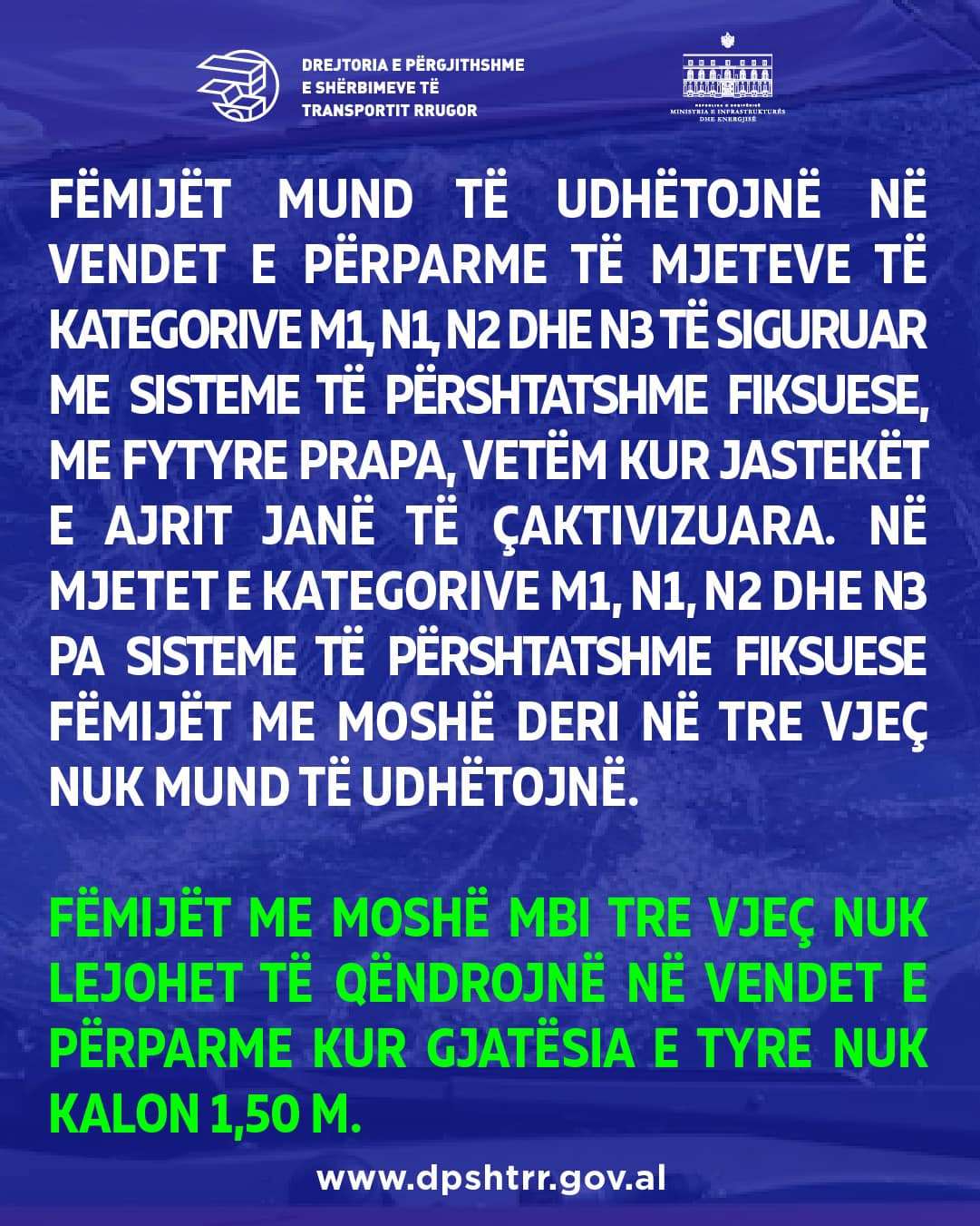 4/2. Fëmijët me moshë mbi tre vjeç nuk lejohet të qëndrojnë në vendet e përparme kur gjatësia e tyre nuk kalon 1,50 m.”
