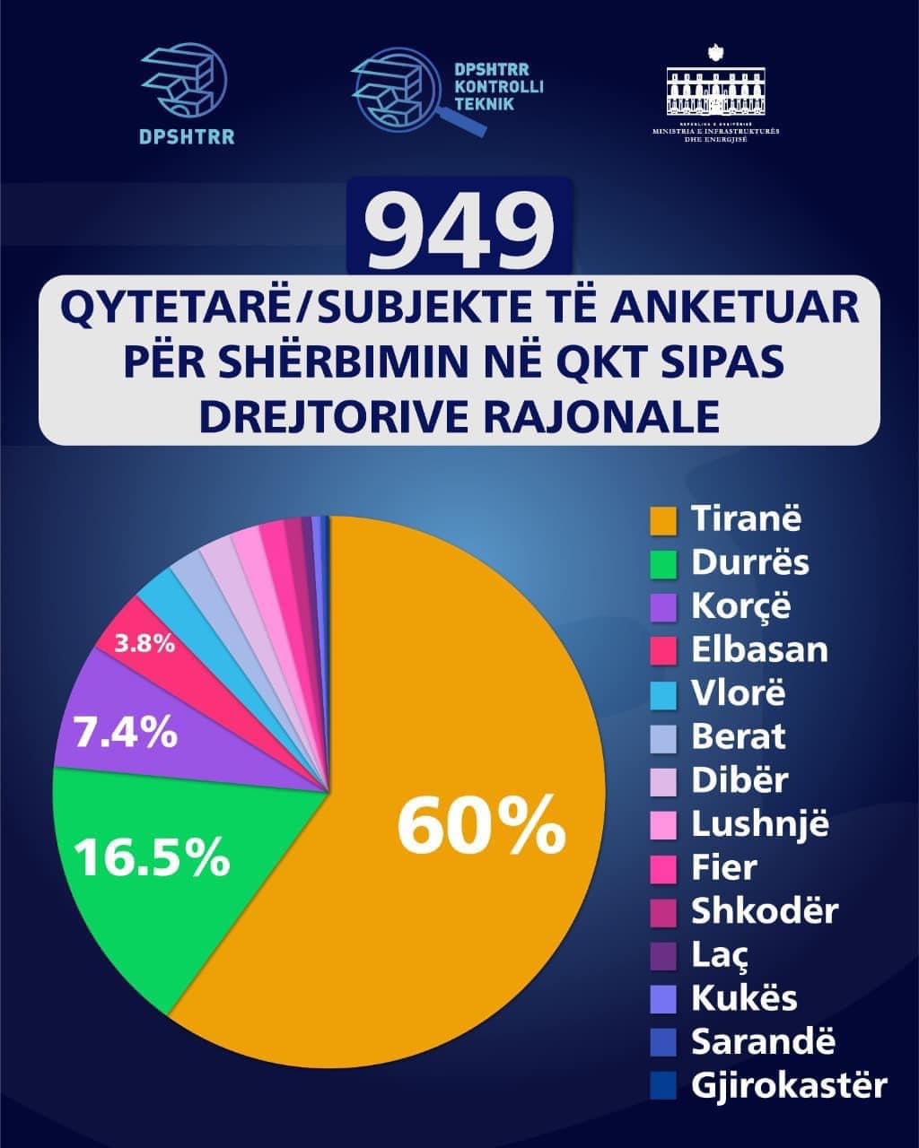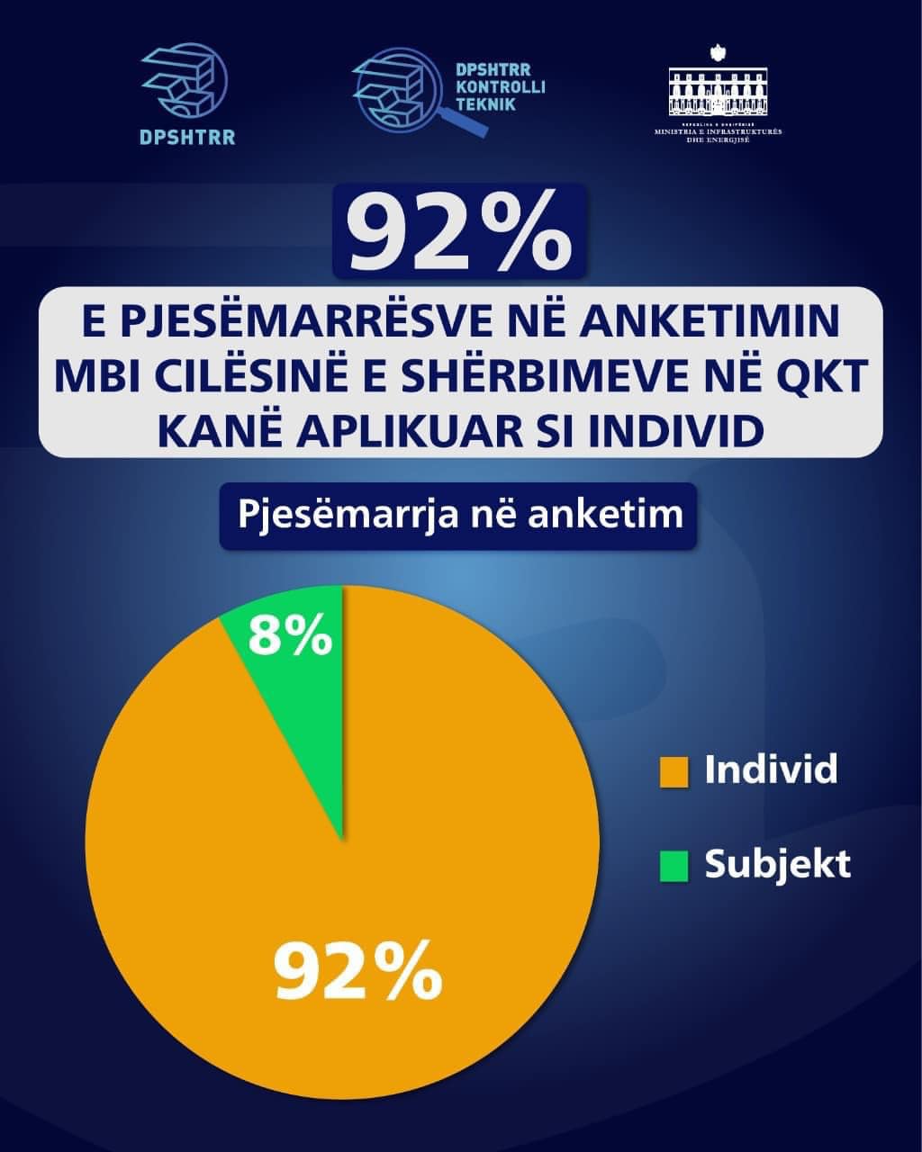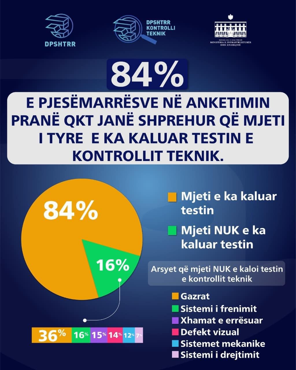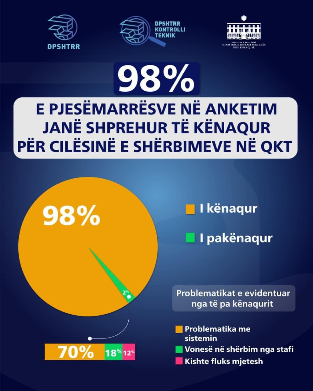 Sipas monitorimeve në terren dhe përmes telefonatave, rreth 98% e qytetarëve të anketuar, kanë mbetur të kënaqur me shërbimin në Qendrat e Kontrollit Teknik dhe 84.6% e tyre vlerësojnë se shërbimi është përmirësuar ndjeshëm krahasuar me 2 vite më parë.