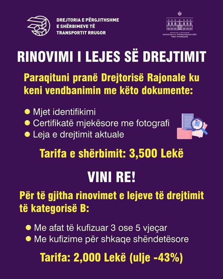 Nisëm ofrimin e rinovimit të lejes së drejtimit me afat të kufizuar, 3-5 vjeçare dhe çdo rinovim leje drejtimi (B) me kufizim afati për shkaqe shëndetësore, me tarifën e re, të ULUR -43%!