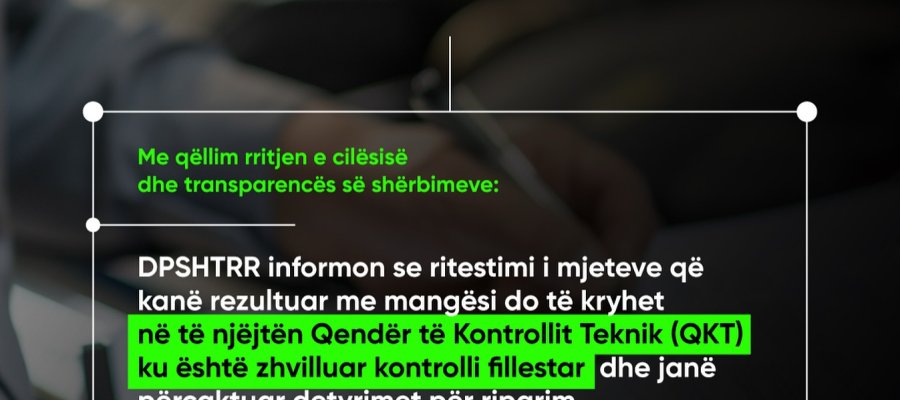 Me qëllim rritjen e cilësisë dhe transparencës së shërbimeve, DPSHTRR informon se ritestimi i mjeteve që kanë rezultuar me mangësi do të kryhet në të njëjtën Qendër të Kontrollit Teknik (QKT) ku është zhvilluar kontrolli fillestar dhe janë përcaktuar detyrimet për riparim.