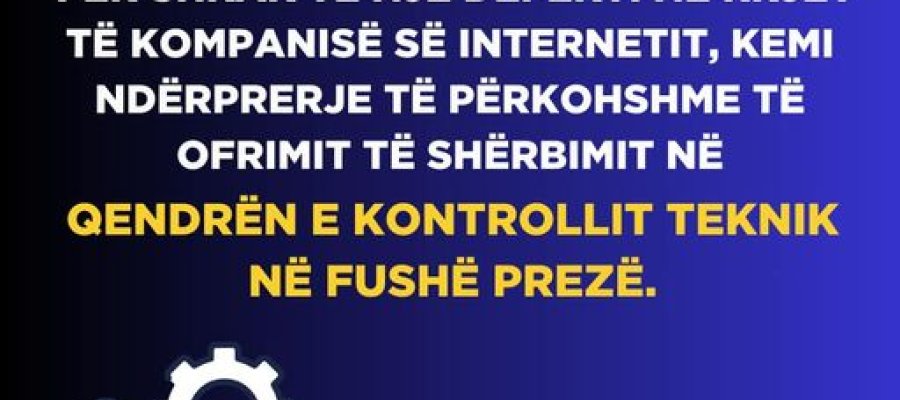 Të nderuar qytetarë, për shkak të një defekti në rrjet të kompanisë së internetit pranë Qendrës së Kontrollit Teknik në Fushë Prezë jemi përballur me një ndërprerje të përkohshme të ofrimit të shërbimit të Kontrollit Teknik!
