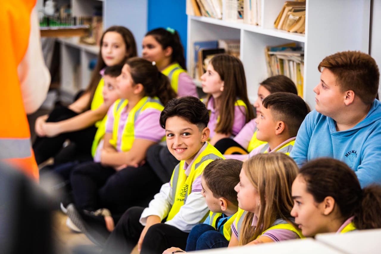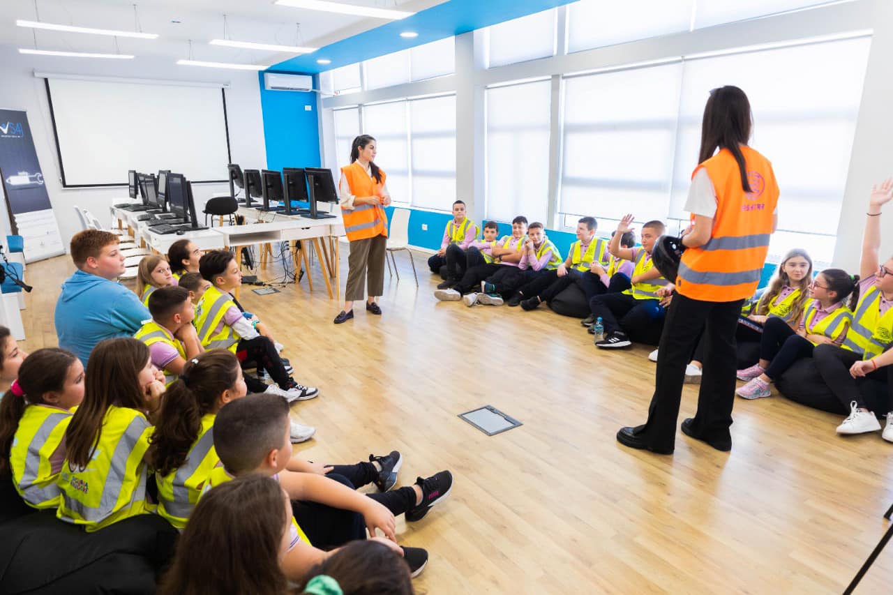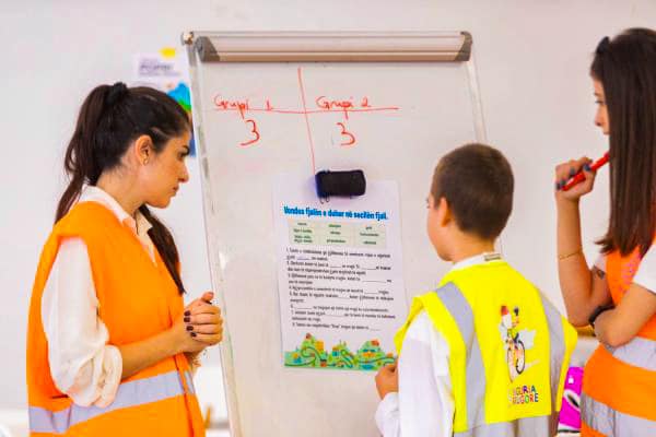 Me nxënësit e shkollës "Numani" nga qyteti i Fierit dhe shkollës “Lef Sallata” nga Vlora, në Këndin e Edukimit mbi Sigurinë Rrugore në ambientet e Shkollës së Mesme Industriale "Pavarësia", Vlorë, ku fëmijët mësojnë mbi rregullat e trafikut rrugor dhe këshillat mbi sigurinë rrugore në hapësirën e posaçme që simulon qarkullimin me sinjalistikat e duhura rrugore.