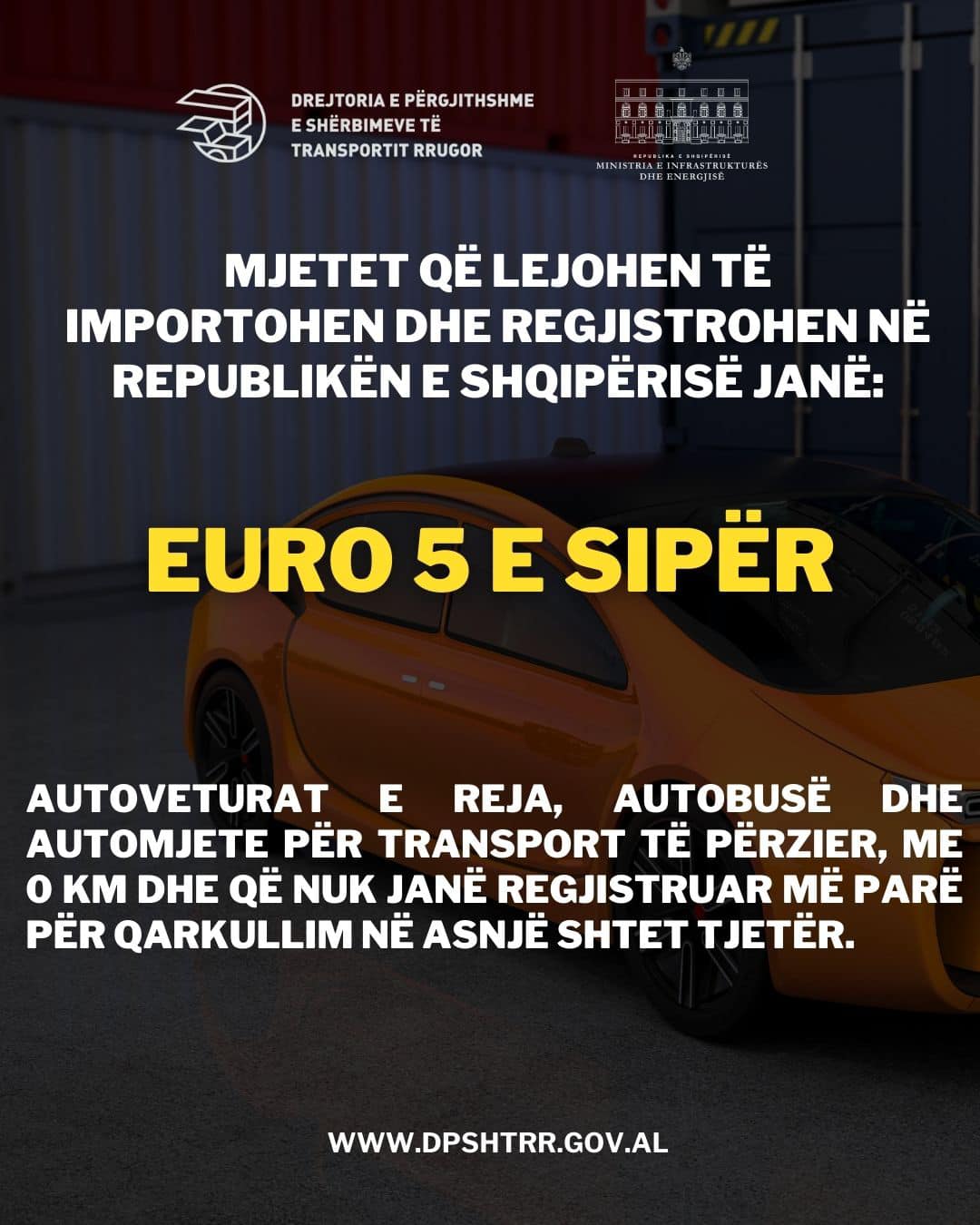 • Për kategorinë mjedisore EURO 5 e sipër, lejohet të importohen Autoveturat e reja, Autobusë dhe Automjete për Transport të Përzier (ATP, ATV, APV) me zero km dhe që nuk janë regjistruar më parë për qarkullim në asnjë shtet tjetër.