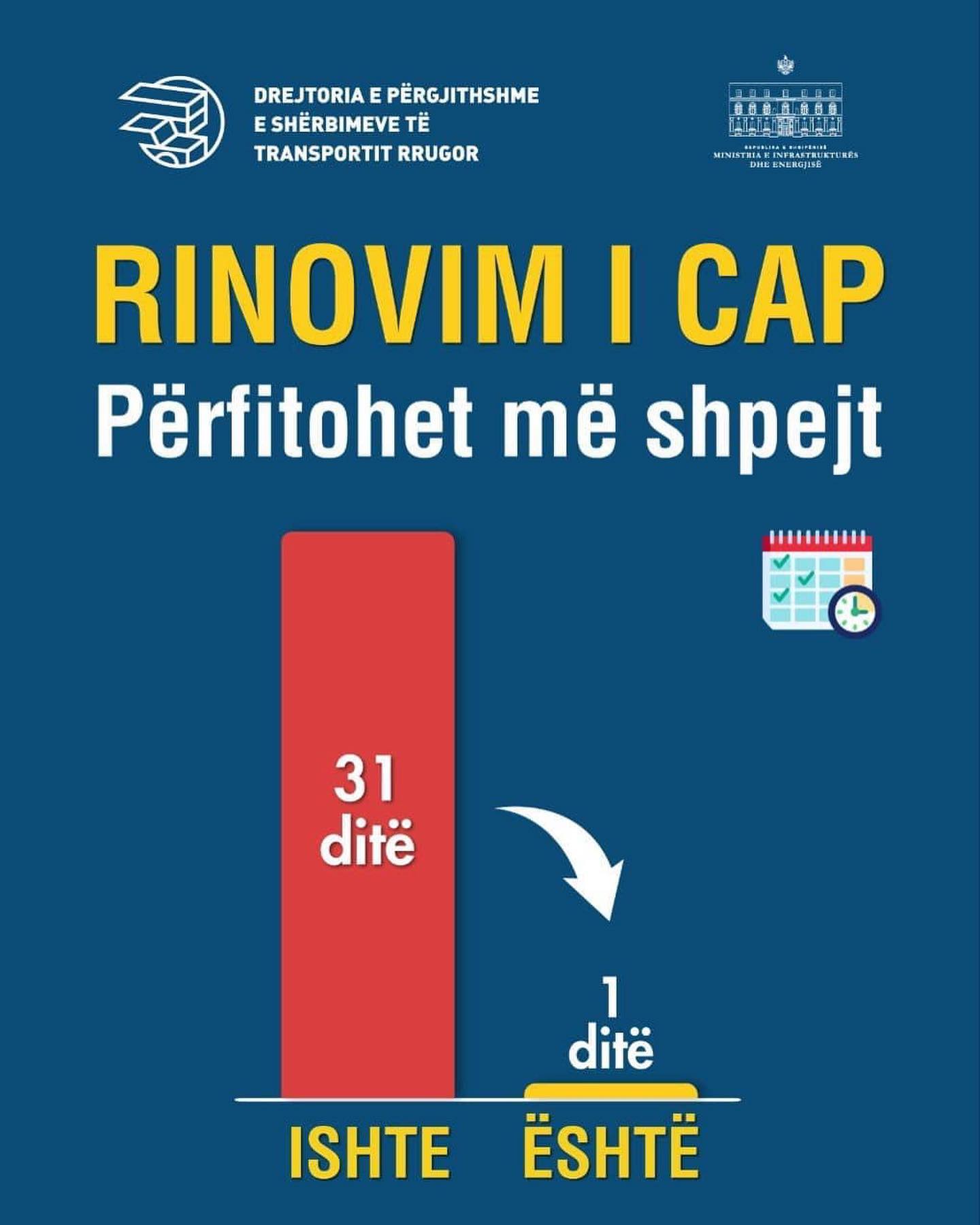 Rinovimi i Certifikatës së Aftësimit Profesional (CAP) për të gjithë drejtuesit e mjeteve të transportit rrugor të mallrave dhe të pasagjerëve, realizohet shumë më shpejt dhe shumë më lirë. Drejtoria e Përgjithshme e Shërbimeve të Transportit Rrugor njofton se nga përshpejtimi i rinovimit të CAP përkundrejt kostove më të ulëta do të përfitojnë vetëm për vitin 2022 rreth 13,703 drejtues mjetesh të transportit të mallrave dhe të pasagjerëve me leje drejtimi të kategorive C1, C, C1E, CE, D1, D, D1E dhe DE.