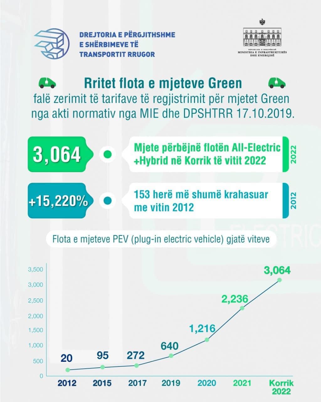 Deri në fund të muajit Korrik të vitit 2022 kishim një flotë prej 3,064 mjete GREEN (Plug-in elektrik dhe Hybrid) ose 3,044 Mjete GREEN më shumë se sa flota e vitit 2012 kur ishin vetëm 20 të tilla (153 herë më shumë).