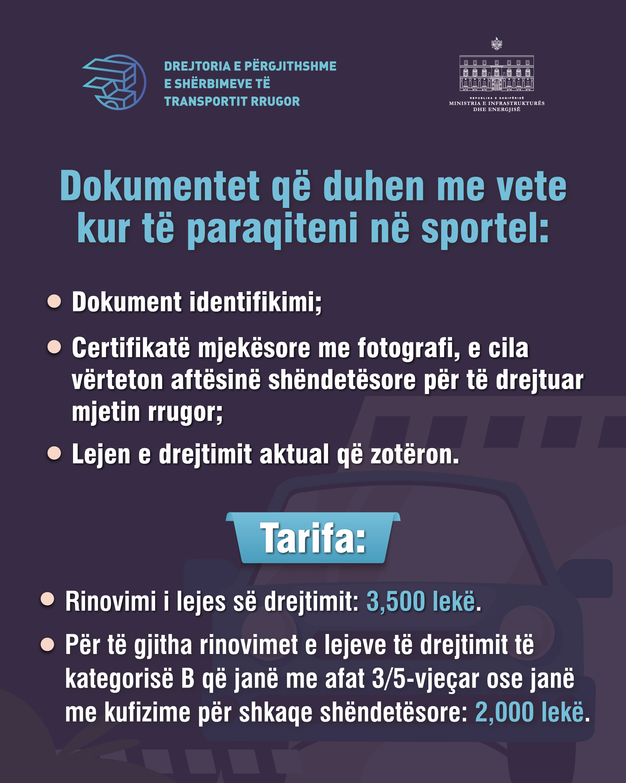 • Rinovimi i lejes së drejtimit: 3,500 lekë.