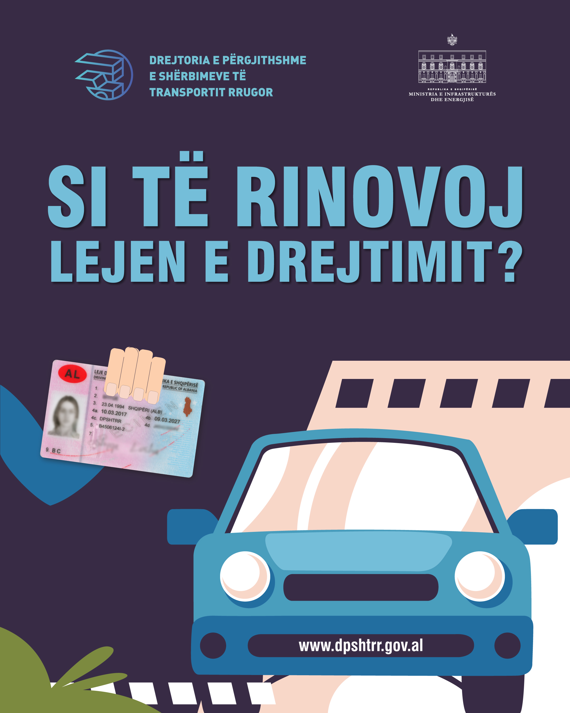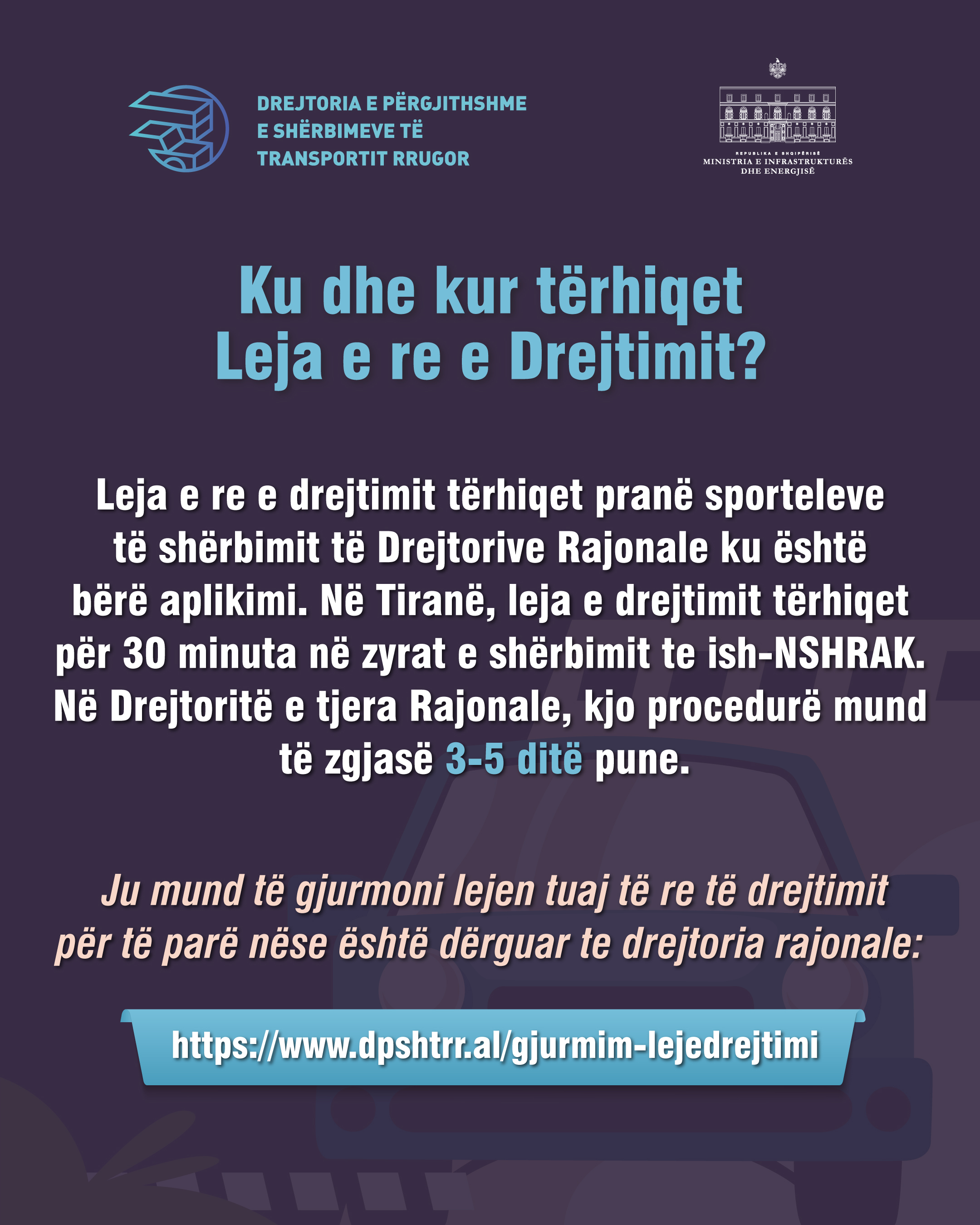 • Leja e re e Drejtimit tërhiqet pranë sporteleve të shërbimit të Drejtorive Rajonale ku është bërë aplikimi. Në Tiranë, leja e drejtimit tërhiqet për 30 minuta në zyrat e shërbimit te ish-NSHRAK. Në Drejtoritë e tjera Rajonale, kjo procedurë mund të zgjasë 3-5 ditë pune. Ju mund të gjurmoni lejen tuaj të re të drejtimit për të parë nëse është dërguar te drejtoria rajonale:https://www.dpshtrr.al/gjurmim-lejedrejtimi!