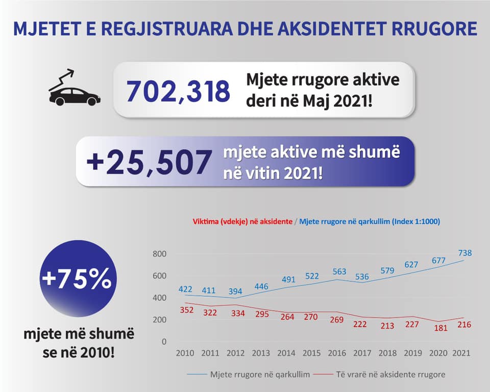702,318 mjete rrugore aktive deri sot., +25,507 në 2021, projeksioni për vitin 2021 jep +75% mjete më shumë se në vitin 2010.