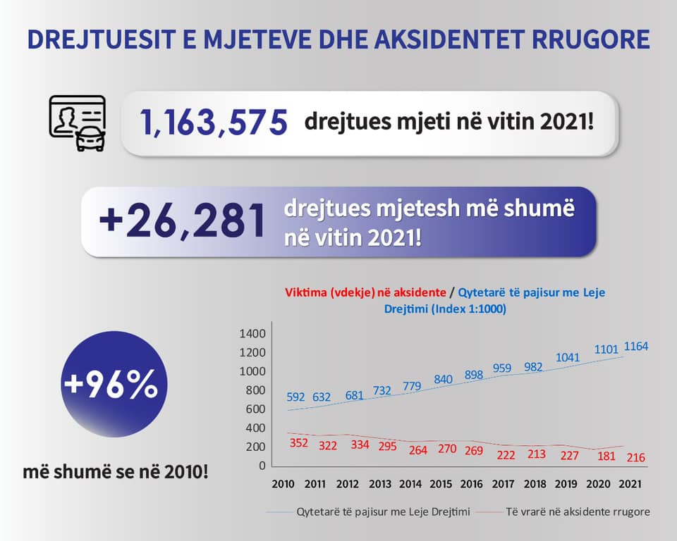 Gjatë periudhës Janar-Maj 2021 në Shqipëri, më shumë mjete dhe drejtuesa mjeti, por më pak aksidente dhee ulje indeksesh fataliteti krahasuar me vitin 2010:
