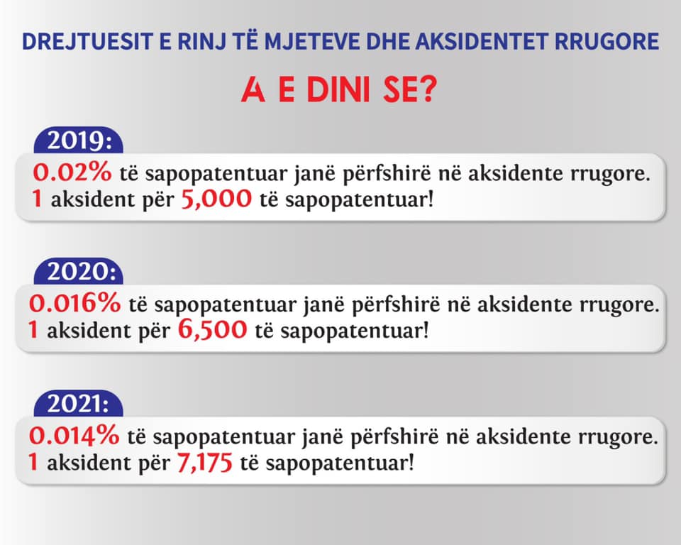 0.014% mundësia që një i sapopatentuar të shkaktojë aksidente rrugore, 1 aksident për 7,175 të sapopatentuar në vitin 2021.