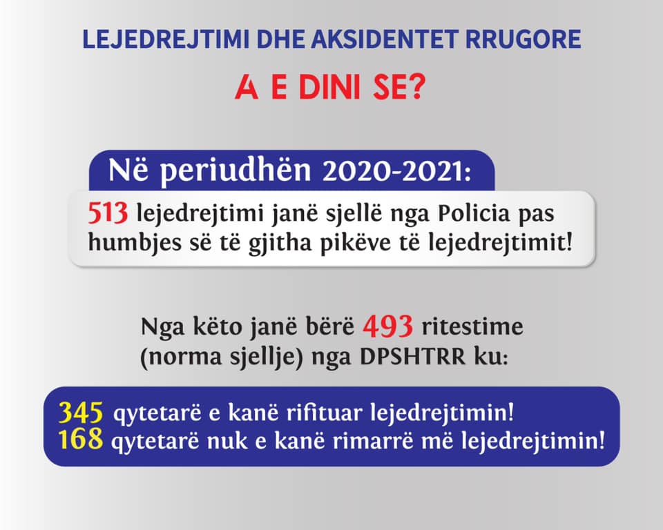513 lejedrejtimi janë sjellë nga Policia pas humbjes së gjithë pikëve, për periudhën 2020-2021. Nga këto janë bërë 493 ritestime dhe vetëm 345 qytetarë kanë rifituar lejedrejtimin.