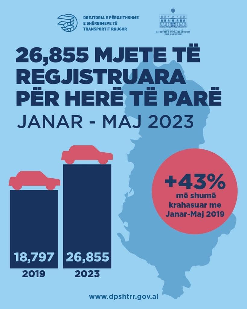 • Gjatë periudhës Janar-Maj 2023, janë regjistruar për herë të parë 26,855 mjete ose 43% më shumë se viti 2019!