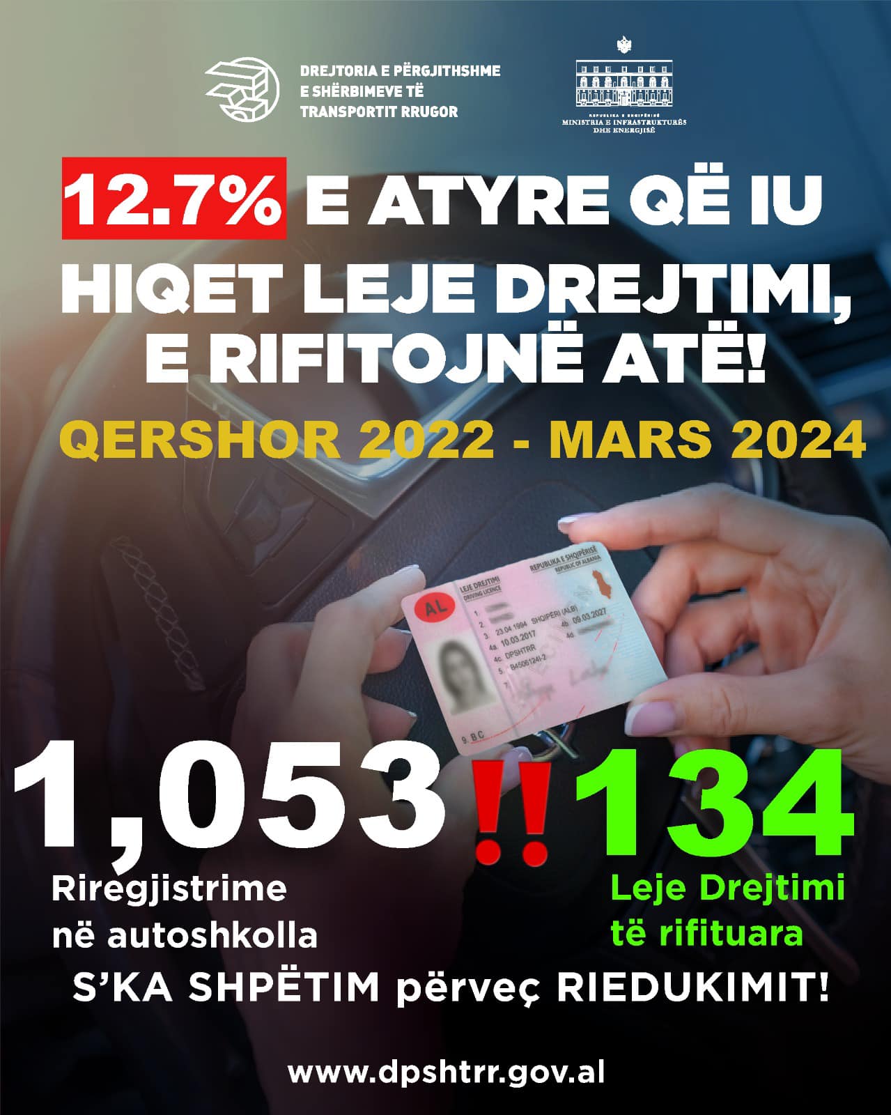 Vetëm 134 persona nga 1053 riregjistrime në autoshkollë për shkak të heqjeve të pikëve të patentës, e kanë rifituar Lejen e Drejtimit gjatë periudhës Qershor 2022-Mars 2024!