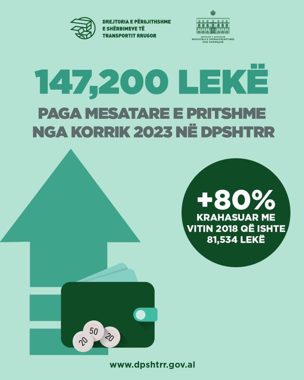Drejtoria e Përgjithshme e Shërbimeve të Transportit Rrugor është sot një ent, një realitet që dallohet për tregues pozitiv rekord në shërbime e rezultate të larta përgjatë viteve të fundit, edhe falë ekipit të motivuar, të përkushtuar dhe me rritje profesionale. Në një periudhë emergjence nga tërmeti, pasuar nga pandemia dhe kriza e ngjarjeve në Ukrainë, Drejtoria e Përgjithshme e Shërbimeve të Transportit Rrugor është nga të paktat raste që në kushte vetëfinancimi, një ndërmarrje jobuxhetore të gjenerojë kaq shumë punësim cilësor. Ku faktet flasin vetë:  +52% më shumë vende pune në DPSHTRR, krahasuar me vitin 2018, 467 punësime të reja 2019-2023, të rinj të punësuar me moshë mesatare 37 vjeç,  147,200 lekë paga mesatare (përfshirë bonuset) nga muaji korrik 2023, ose 80% më e lartë krahasuar me vitin 2018. Meritokraci dhe dinjitet për 1,097 punonjës të shërbimeve të transportit rrugor.
