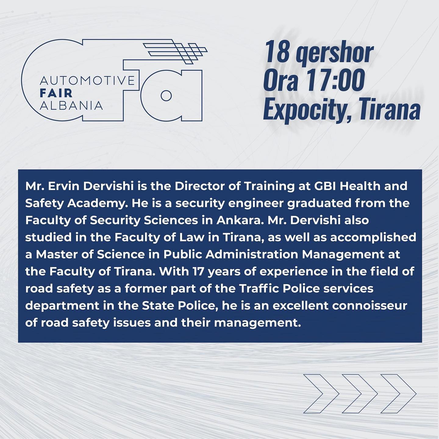 Z. Ervin Dervishi, Drejtor i Trajnimeve në GBI, do të sjellë në forum eksperiencën e tij 17 vjeçare, në fushën e sigurisë rrugore, si pjesë e departamentit të shërbimeve të Policisë Rrugore në Policinë e Shtetit.